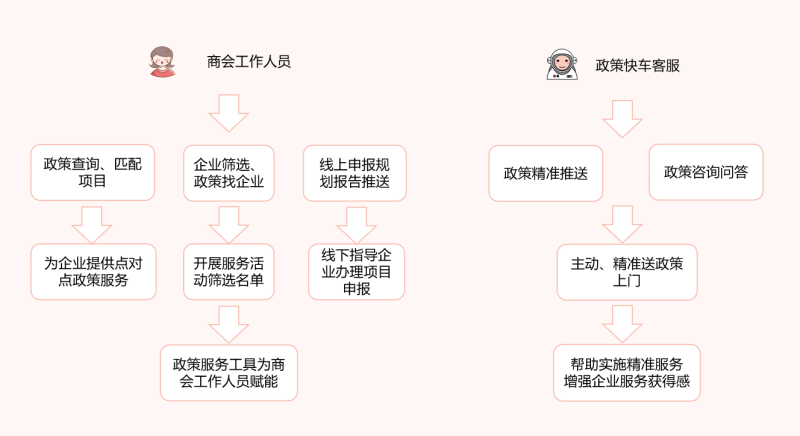 政策快車(chē)是湖南省拾牛網(wǎng)絡(luò )科技有限公司具有自主知識產(chǎn)權的一款智能化政策服務(wù)工具,基于“互聯(lián)網(wǎng)+人工智能+大數據”技術(shù),為企業(yè)智能匹配、精準推送符合條件的政策項目,為政府、園區、平臺、商協(xié)會(huì )等企業(yè)服務(wù)組織篩選已獲政策支持企業(yè)和政策培育企業(yè)。政策快車(chē)還具有申報大數據分析、企業(yè)申報對標分析、申報規劃報告下載、項目精準測評、政策支持效果評估、政策支持統計分析等強大功能,不僅提高了商會(huì )工作人員的工作效率,還能幫助企業(yè)服務(wù)組織實(shí)施精準服務(wù),增強企業(yè)服務(wù)獲得感。