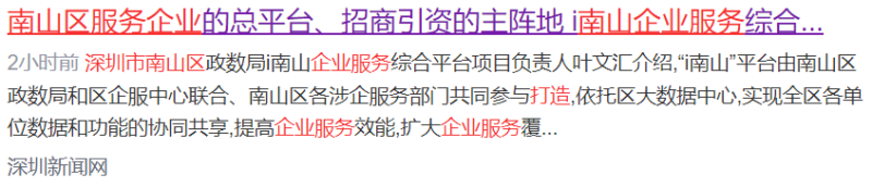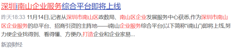 11月14日,深圳市南山區政數局、南山區企業(yè)發(fā)展服務(wù)中心聯(lián)合召開(kāi)了i南山企業(yè)服務(wù)綜合平臺媒體通氣會(huì ),作為深圳市南山區服務(wù)企業(yè)的總平臺、招商引資的主陣地——i南山企業(yè)服務(wù)綜合平臺即將上線(xiàn),將覆蓋近55萬(wàn)家南山市場(chǎng)主體,實(shí)現永遠在線(xiàn)的企業(yè)服務(wù);對標全國全球優(yōu)質(zhì)項目,開(kāi)展永不落幕的招商引資。會(huì )后,深圳新聞網(wǎng)、新浪新聞、騰訊新聞等各大媒體紛紛報道。